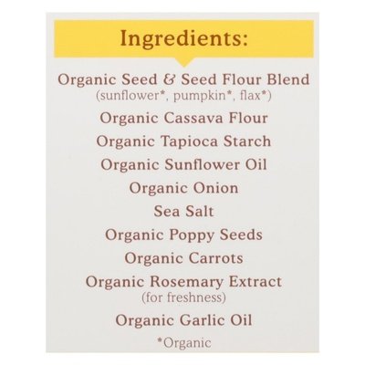 INGREDIENTS: Organic Seed & Seed Flour Blend (Sunflower (Organic), Pumpkin (Organic), Flax (Organic)) Organic Cassava Flour Organic Tapioca Starch Organic Sunflower Oil Organic Onion Sea Salt Organic Poppy Seeds Organic Carrots Organic Rosemary Extract (for Freshness) Organic Garlic Oil.