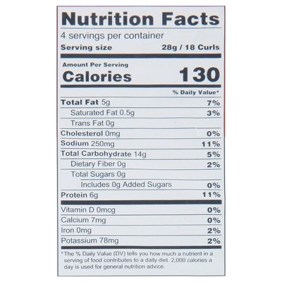 PRODUCT DETAILS: 6 g protein per serving. Gluten free. Certified Organic by Baystate Organic Certifiers. Certified Paleo. Grain Free. Lab-tested nograin.org. Non-GMO Project verified. nongmoproject.org. Simple acts. Clean snacks. Protein from egg whites. This product has a PDCAAS value of 1. Making healthier, less processed, earth-friendly snacking accessible to everyone. Clean protein and good fat make for an efficient energy source for your body. These crunchy Power Curls use humanely raised, cage-free egg white powder and avocado oil to provide 5 g fat and 6 g protein per serving. You can feel good about taking these for a dip (or double dip)! Simple Acts, Clean Snacks: We live in a world full of distractions. We can't change that, but we can all find ways to slow down and savor the little moments. It's the small things in life, like sharing stories, smiles, laughter, or even snacks, that make us happiest. At LesserEvil, we believe that just a few simple acts can make a big difference. By sourcing organic ingredients, using better oils, and practicing sustainability, we're able to make cleaner, tastier, and more environmentally friendly snacks. Focusing on what we can do to be a better company is our small way of contributing to a better world. We are scrappy - Danbury, Connecticut kind of scrappy. We make it happen at our snack factory where we own every ingredient, recipe, and process. It's an East Coast kind of Zen. When wellness guides your spirit, you are your own Guru. lesserevil.com. Connect with the Guru: Facebook. Instagram. Twitter. Chat with the guru! Email: talk2us(at)lesserevil.com. Made with Neo plastics packaging to energy. Neo plastics can increase biogas production at municipal landfills, supporting biogas clean energy programs. Visit neoplastics.com. Humanely raised cage-free eggs. Please discard in the trash do not recycle.