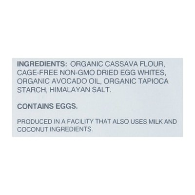 INGREDIENTS: Organic Cassava Flour, Cage Free Non-GMO Dried Egg Whites, Organic Avocado Oil, Organic Tapioca Starch, Himalayan Salt.