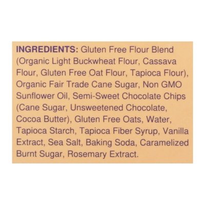 INGREDIENTS: Gluten Free Flour Blend (Organic Light Buckwheat Flour, Cassava Flour, Gluten Free Oat Flour, Tapioca Flour), Organic Fair Trade Cane Sugar, Non GMO Sunflower Oil, Gluten Free Oats, Tapioca Starch, Water, Semi-Sweet Chocolate Chips (Cane Sugar, Unsweetened Chocolate, Cocoa Butter), Tapioca Fiber Syrup, Sea Salt, Vanilla Extract, Baking Soda, Caramelized Cane Sugar, Rosemary Extract.