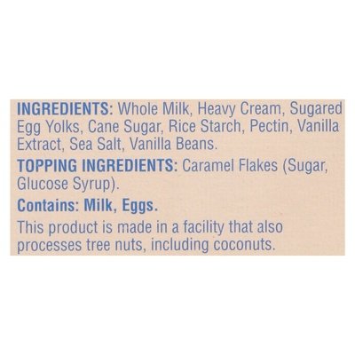 INGREDIENTS: Whole Milk, Heavy Cream, Sugared Egg Yolks, Cane Sugar, Rice Starch, Pectin, Vanilla Extract, Sea Salt, Vanilla Beans. Topping Ingredients: Caramel Flakes (Sugar, Glucose Syrup).