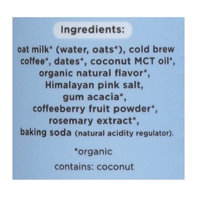 INGREDIENTS: Oat Milk (Organic) (Water, Oats (Organic)), Cold Brew Coffee (Organic), Dates (Organic), Coconut MCT Oil (Organic), Organic Natural Flavor (Organic), Himalayan Pink Salt, Gum Acacia (Organic), Coffeeberry Fruit Powder (Organic), Rosemary Extract (Organic), Baking Soda (Natural Acidity Regulator).