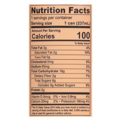 INGREDIENTS: Oat Milk (Organic) (Water, Oats (Organic)), Cold Brew Coffee (Organic), Dates (Organic), Coconut MCT Oil (Organic), Cacao (Organic), Cacao Extract, Himalayan Pink Salt, Gum Acacia (Organic), Ashwagandha (Organic), Maca (Organic), Rosemary Extract (Organic), Baking Soda (Natural Acidity Regulator).