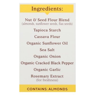 INGREDIENTS: Nut & Seed Flour Blend (Almonds, Sunflower Seeds, Flax Seeds) Tapioca Starch Cassava Flour Organic Sunflower Oil Sea Salt Organic Onion Organic Cracked Black Pepper Organic Garlic Rosemary Extract (for Freshness).