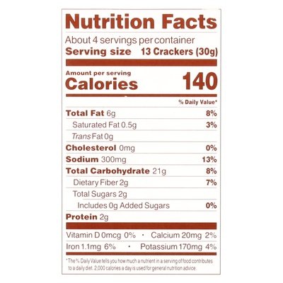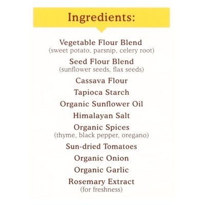 INGREDIENTS: Vegetable Flour Blend (Sweet Potato, Parsnip, Celery Root), Seed Flour Blend (Sunflower Seeds, Flax Seeds), Cassava Flour, Tapioca Starch, Organic Sunflower Oil, Himalayan Salt, Organic Spices (Thyme, Black Pepper, Oregano), Sun-Dried Tomatoes, Organic Onion, Organic Garlic, Rosemary Extract (for Freshness).