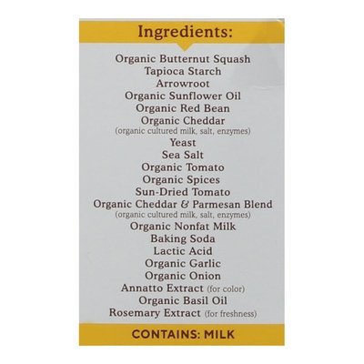 INGREDIENTS: Organic Butternut Squash, Tapioca Starch, Arrowroot, Organic Sunflower Oil, Organic Red Bean, Organic Cheddar (Organic Cultured Milk, Salt, Enzymes), Yeast, Sea Salt, Organic Tomato, Organic Spices, Sun-Dried Tomato, Organic Cheddar & Parmesan Blend (Organic Cultured Milk, Salt, Enzymes), Organic Nonfat Milk, Baking Soda, Lactic Acid, Organic Garlic, Organic Onion, Annatto Extract (for Color), Organic Basil Oil, Rosemary Extract (for Freshness).