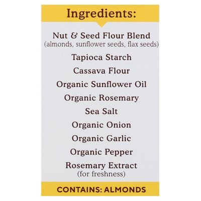 INGREDIENTS: Nut & Seed Flour Blend (Almonds, Sunflower Seeds, Flax Seeds), Tapioca Starch, Cassava Flour, Organic Sunflower Oil, Organic Rosemary, Sea Salt, Organic Onion, Organic Garlic, Organic Pepper, Rosemary Extract (for Freshness).