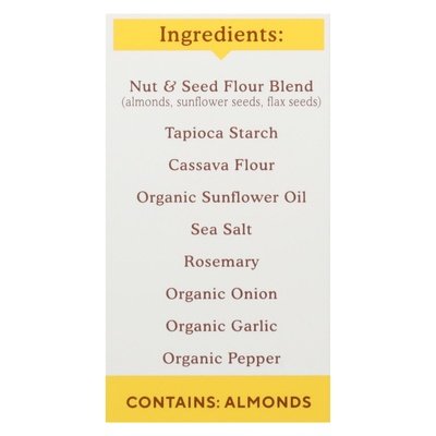 INGREDIENTS: Nut & Seed Flour Blend (Almonds, Sunflower Seeds, Flax Seeds) Tapioca Starch Cassava Flour Organic Sunflower Oil Sea Salt Rosemary Organic Onion Organic Garlic Organic Pepper.