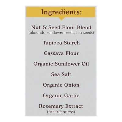 INGREDIENTS: Nut & Seed Flour Blend (Almonds, Sunflower Seeds, Flax Seeds) Tapioca Starch Cassava Flour Organic Sunflower Oil Sea Salt Organic Onion Organic Garlic Rosemary Extract (for Freshness).
