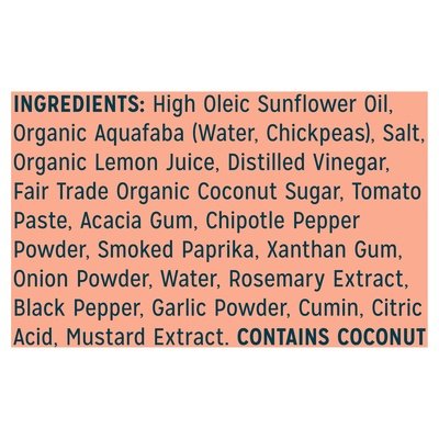 INGREDIENTS: High Oleic Sunflower Oil, Organic Aquafaba (Water, Chickpeas), Salt, Organic Lemon Juice, Distilled Vinegar, Fair Trade Organic Coconut Sugar, Tomato Paste, Acacia Gum, Chipotle Pepper Powder, Smoked Paprika, Xanthan Gum, Onion Powder, Water, Rosemary Extract, Black Pepper, Garlic Powder, Cumin, Citric Acid, Mustard Extract.