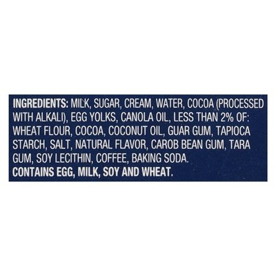 INGREDIENTS: Milk, Sugar, Cream, Water, Cocoa (Processed with Alkali), Egg Yolks, Canola Oil, Less than 2% of: Wheat Flour, Cocoa, Coconut Oil, Guar Gum, Tapioca Starch, Salt, Natural Flavor, Carob Bean Gum, Tara Gum, Soy Lecithin, Coffee, Baking Soda.