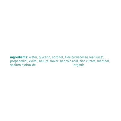 INGREDIENTS: Water, Glycerin, Sorbitol, Aloe Barbadensis Leaf Juice (Organic), Propanediol, Xylitol, Natural Flavor, Benzoic Acid, Zinc Citrate, Menthol, Sodium Hydroxide.