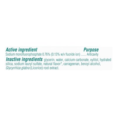 DESCRIPTION: This Products is: Gluten free. Vegan. Hala. The original of Maine. Natural. Fluoride free. Clinically proven to freshen breath. Fights cavities. Blocks bad breath. We've combined scientific know-how and naturally sourced and derived ingredients to make products that are good for you since 1970. Beyond making effective products, Tom and Kate created Tom's of Maine to be a force for good and that still drives us today! We've got big goals to help combat climate change and social inequities, which is why we donate to non-profit organizations that focus on climate change, health and well-being and disaster relief. www.tomsofmaine.com. To learn more about our mission, rigorous ingredient and packaging standards, and what natural means at Tom’s, go to www.tomsofmaine.com. You will find every ingredient’s purpose and source there too. 1-800-For-Toms (1-800-367-8667). Certified B Corporation. Certified 100% recycled paperboard. Not tested on animals. No animal testing, artificial flavors, sweeteners or dyes. The first of its kind recyclable tube. Your community may not yet accept tubes for recycling. Check locally. Learn more at tomsofmaine.com/recyclable-tube. Thoughtfully blended & packaged in the USA with US & globally sourced ingredients. < Active < Sodium Monofluorophosphate (0.13% w/v Fluoride Ion) (0.76 %), Anticavity. Inactive < Glycerin, Water, Calcium Carbonate, Xylitol, Hydrated Silica, Sodium Lauryl Sulfate, Natural Flavor (Spearmint Oil and Other Natural Flavor), Carrageenan, Benzyl Alcohol, Glycyrrhiza Glabra (Licorice) Root Extract.