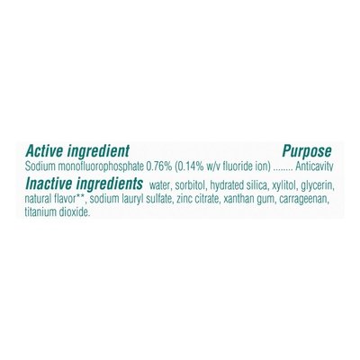 INGREDIENTS: Active Ingredients: Sodium Monofluorophosphate (0.14% w/v Fluoride Ion) (0.76 %), Anticavity. Inactive Ingredients: Water, Sorbitol, Hydrated Silica, Xylitol, Glycerin, Natural Flavor (Wintergreen Oil and Other Natural Flavor), Sodium Lauryl Sulfate, Zinc Citrate, Xanthan Gum, Carrageenan, Titanium Dioxide.