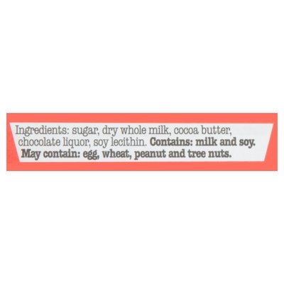 INGREDIENTS: Sugar, Dry Whole Milk, Cocoa Butter, Chocolate Liquor, Soy Lecithin.