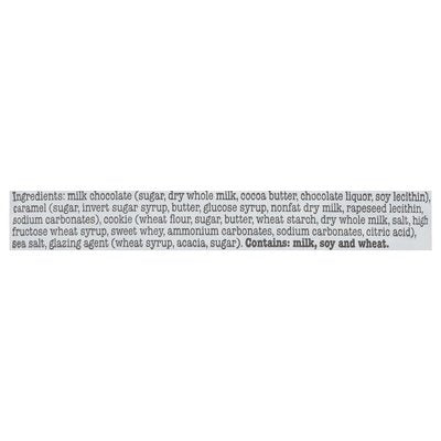 INGREDIENTS: Milk Chocolate (Sugar, Dry Whole Milk, Cocoa Butter, Chocolate Liquor, Soy Lecithin), Caramel (Sugar, Invert Sugar Syrup, Butter, Glucose Syrup, Nonfat Dry Milk, Rapeseed Lecithin, Sodium Carbonates), Cookie (Wheat Flour, Sugar, Butter, Wheat Starch, Dry Whole Milk, Salt, High Fructose Wheat Syrup, Sweet Whey, Ammonium Carbonates, Sodium Carbonates, Citric Acid), Sea Salt, Glazing Agent (Wheat Syrup, Acacia, Sugar).