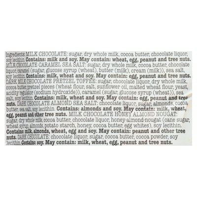 INGREDIENTS: Milk Chocolate: Sugar, Dry Whole Milk, Cocoa Butter, Chocolate Liquor, Soy Lecithin. Milk Chocolate Caramel Sea Salt: Sugar, Dry Whole Milk, Cocoa Butter, Chocolate Liquor, Caramel (Sugar, Glucose Syrup (Wheat), Butter (Milk), Cream (Milk)), Sea Salt, Soy Lecithin Dark Milk Chocolate Pretzel Toffee: Sugar, Chocolate Liquor, Dry Whole Milk, Cocoa Butter, Pretzel Pieces (Wheat Flour, Salt, Sunflower Oil, Malted Wheat Flour, Yeast, Acidity Regulator (Sodium Hydroxide)), Caramel (Sugar, Glucose Syrup (Wheat)), Sea Salt, Soy Lecithin. Dark Chocolate Almond Sea Salt: Chocolate Liquor, Sugar, Almonds, Cocoa Butter, Sea Salt, Soy Lecithin. Milk Chocolate Honey Almond Nougat: Sugar, Dry Whole Milk, Cocoa Butter, Chocolate Liquor, Honey-Almond-Nougat (Cane Sugar, Wheat Syrup, Almonds, Potato Starch, Honey, Cocoa Butter, Egg Whites), Soy Lecithin. Dark Chocolate: Chocolate Liquor, Sugar, Cocoa Butter, Cocoa Powder, Soy Lecithin.