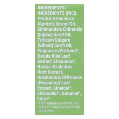 INGREDIENTS: Prunus Armeniaca (Apricot) Kernel Oil, Simmondsia Chinensis (Jojoba) Seed Oil, Triticum Vulgare (Wheat) Germ Oil, Fragrance (Parfum) (from Natural Essential Oils), Betula Alba Leaf Extract, Limonene (from Natural Essential Oils), Ruscus Aculeatus Root Extract, Rosmarinus Officinalis (Rosemary) Leaf Extract, Linalool (from Natural Essential Oils), Citronellol (from Natural Essential Oils), Geraniol (from Natural Essential Oils), Citral (from Natural Essential Oils).