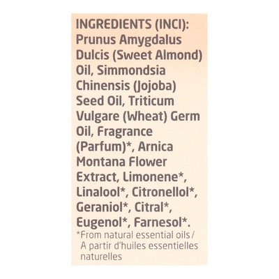 INGREDIENTS: Prunus Amygdalus Dulcis (Sweet Almond) Oil, Simmondsia Chinensis (Jojoba) Seed Oil, Triticum Vulgare (Wheat) Germ Oil, Fragrance (Parfum) (from Natural Essential Oils), Arnica Montana Flower Extract, Limonene (from Natural Essential Oils), Linalool (from Natural Essential Oils), Citronellol (from Natural Essential Oils), Geraniol (from Natural Essential Oils), Citral (from Natural Essential Oils), Eugenol (from Natural Essential Oils), Farnesol (from Natural Essential Oils).