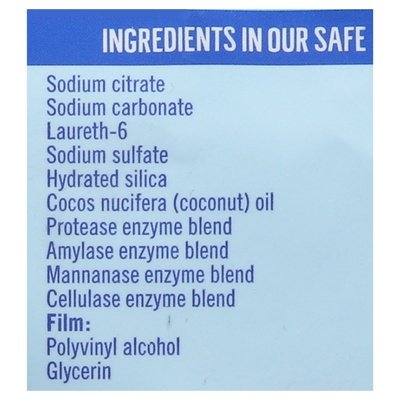 INGREDIENTS: Ingredients in Our Safe (Safe When Used as Directed) & Effective Formula: Sodium Citrate (Plant-Derived Water Softener), Sodium Carbonate (Mineral-Based Cleaning Agent), Laureth-6 (Plant-Derived Cleaning Agent), Sodium Sulfate (Mineral-Based Processing Aid), Hydrated Silica (Mineral-Based Flow Aid), Cocos Nucifera (Coconut) Oil (Plant-Derived Anti-Foaming Agent), Protease Enzyme Blend (Plant-Based Soil Remover), Amylase Enzyme Blend (Plant-Based Soil Remover), Mannanase Enzyme Blend (Plant-Based Soil Remover), Cellulase Enzyme Blend (Plant-Based Soil Remover), Film: Polyvinyl Alcohol (Synthetic Water-Soluble Film), Glycerin (Plant-Derived Processing Aid).