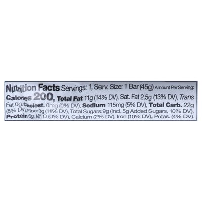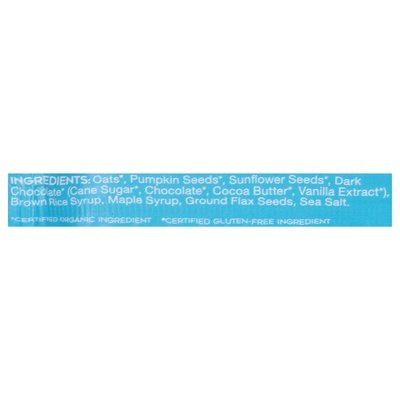 INGREDIENTS: 88 Acres Seed Blend (Organic Sunflower Seeds, Organic Pumpkin Seeds, Flax Seeds), Gluten-Free Certified Oats, Brown Rice Syrup, Maple Syrup, Organic Dark Chocolate (Organic Cane Sugar, Organic Chocolate Liquor, Organic Cocoa Butter, Organic Vanilla Extract), Sea Salt.