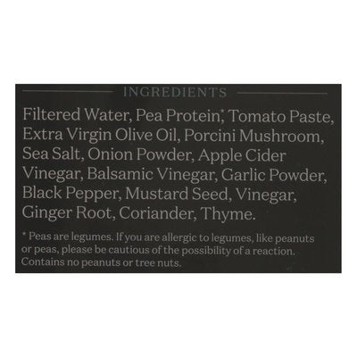 INGREDIENTS: Filtered Water, Pea Protein (Peas Are Legumes. If You Are Allergic to Legumes, Like Peanuts or Peas, Please Be Cautious of the Possibility of a Reaction), Tomato Paste, Extra Virgin Olive Oil, Porcini Mushroom, Sea Salt, Onion Powder, Apple Cider Vinegar, Balsamic Vinegar, Garlic Powder, Black Pepper, Mustard Seed, Vinegar, Ginger Root, Coriander, Thyme.