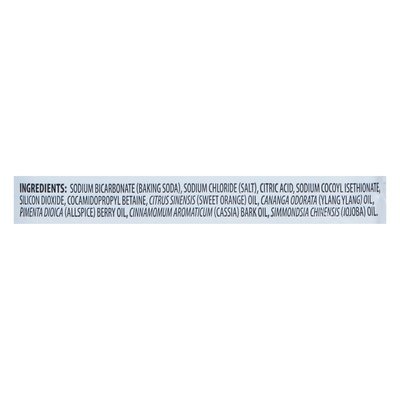 INGREDIENTS: Sodium Bicarbonate (Baking Soda), Sodium Chloride (Salt), Citric Acid, Sodium Cocoyl Isethionate, Silicon Dioxide, Cocamidopropyl Betaine, Citrus Sinensis (Sweet Orange) Oil, Cananga Odorata (Ylang Ylang) Oil, Pimenta Dioica (Allspice) Berry Oil, Cinnamomum Aromaticum (Cassia) Bark Oil, Simmondsia Chinensis (Jojoba) Oil.
