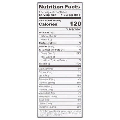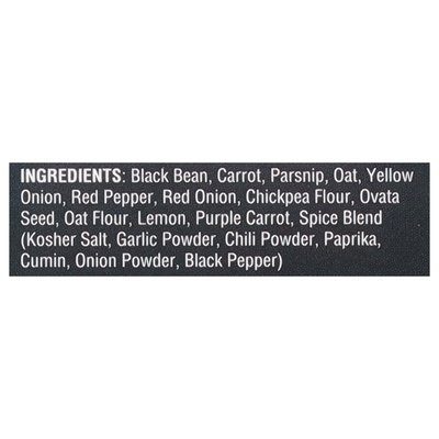 INGREDIENTS: Black Bean, Carrot, Parsnip, Oat, Yellow Onion, Red Pepper, Red Onion, Chickpea Flour, Ovata Seed, Oat Flour, Lemon, Purple Carrot, Spice Blend (Kosher Salt, Garlic Powder, Chili Powder, Paprika, Cumin, Onion Powder, Black Pepper).