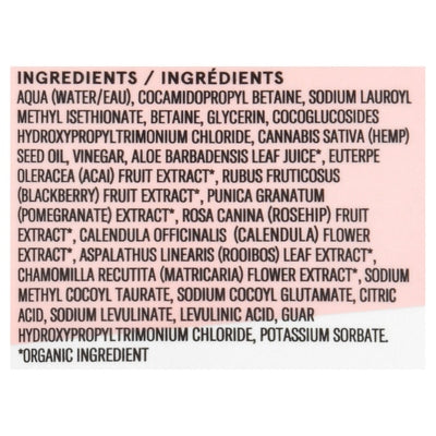 INGREDIENTS: Aqua (Water/Eau), Cocamidopropyl Betaine, Sodium Lauroyl Methyl Isethionate, Betaine, Glycerin, Cocoglucosides Hydroxypropyltrimonium Chloride, Cannabis Sativa (Hemp) Seed Oil, Vinegar, Aloe Barbadensis Leaf Juice (Organic Ingredient), Euterpe Oleracea (Acai) Fruit Extract (Organic Ingredient), Rubus Fruticosus (Blackberry) Fruit Extract (Organic Ingredient), Punica Granatum (Pomegranate) Extract (Organic Ingredient), Rosa Canina (Rosehip) Fruit Extract (Organic Ingredient), Calendula Officinalis (Calendula) Flower Extract (Organic Ingredient), Aspalathus Linearis (Rooibos) Leaf Extract (Organic Ingredient), Chamomilla Recutita (Matricaria) Flower Extract (Organic Ingredient), Sodium Methyl Cocoyl Taurate, Sodium Cocoyl Glutamate, Citric Acid, Sodium Levulinate, Levulinic Acid, Guar Hydroxypropyltrimonium Chloride, Potassium Sorbate.