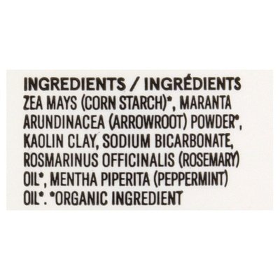 INGREDIENTS: Zea Mays (Corn Starch) (Organic Ingredient), Maranta Arundinacea (Arrowroot) Powder (Organic Ingredient), Kaolin Clay, Sodium Bicarbonate, Rosmarinus Officinalis (Rosemary) Oil (Organic Ingredient), Mentha Piperita (Peppermint) Oil (Organic Ingredient).