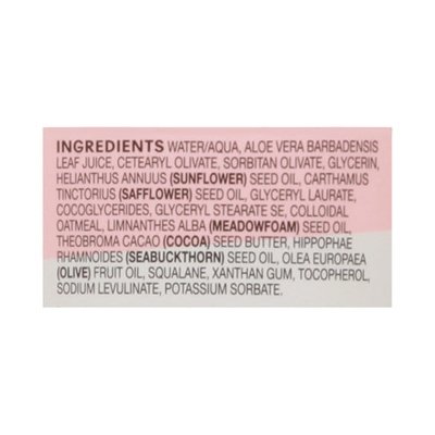 INGREDIENTS: Water/Aqua, Aloe Vera Barbadensis Leaf Juice, Cetearyl Olivate, Sorbitan Olivate, Glycerin, Helianthus Annuus (Sunflower)Seed Oil, Carthamus Tinctorius (Safflower) Seed Oil, Glyceryl Laurate, Cocoglycerides, Glyceryl Stearate SE, Colloidal Oatmeal, Limnanthes Alba (Meadowfoam) Seed Oil, Theobroma Cacao (Cocoa) Seed Butter, Hippophae Rhamnoides (Seabuckthorn) Seed Oil, Olea Europaea (Olive) Fruit Oil, Squalane, Xanthan Gum, Tocopherol, Sodium Levulinate, Potassium Sorbate.