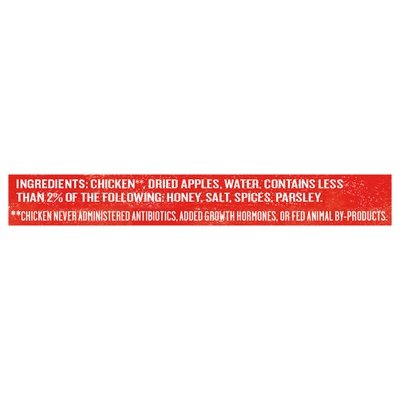 INGREDIENTS: Chicken (Chicken Never Administered Antibiotics or Animal By-Products), Dried Apples, Water, Contains Less than 2% of the Following: Honey, Salt, Spices, Parsley.