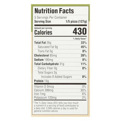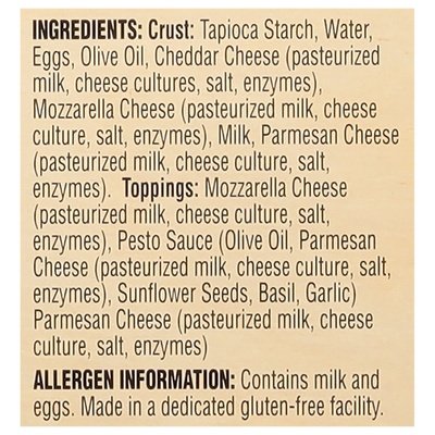 INGREDIENTS: Crust: Tapioca Starch, Water, Eggs, Olive Oil, Cheddar Cheese (Pasteurized Milk, Cheese Cultures, Salt, Enzymes), Mozzarella Cheese (Pasteurized Milk, Cheese Culture, Salt, Enzymes), Milk, Parmesan Cheese (Pasteurized Milk, Cheese Culture, Salt, Enzymes), Toppings: Mozzarella Cheese (Pasteurized Milk, Cheese Culture, Salt, Enzymes), Pesto Sauce (Olive Oil, Parmesan Cheese (Pasteurized Milk, Cheese Culture, Salt, Enzymes), Sunflower Seeds, Basil, Garlic) Parmesan Cheese (Pasteurized Milk, Cheese Culture, Salt, Enzymes).