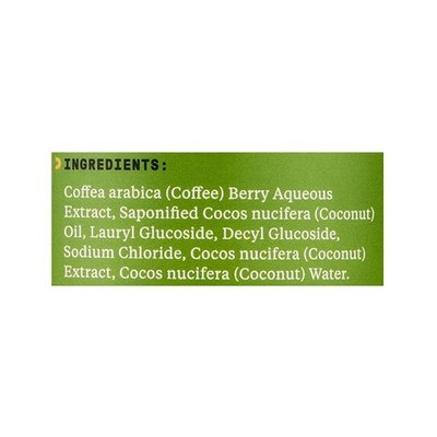 INGREDIENTS: Coffea Arabica (Coffee) Berry Aqueous Extract, Saponified Cocos Nucifera (Coconut) Oil, Lauryl Glucoside, Decyl Glucoside, Sodium Chloride, Cocos Nucifera (Coconut) Extract, Cocos Nucifera (Coconut) Water.