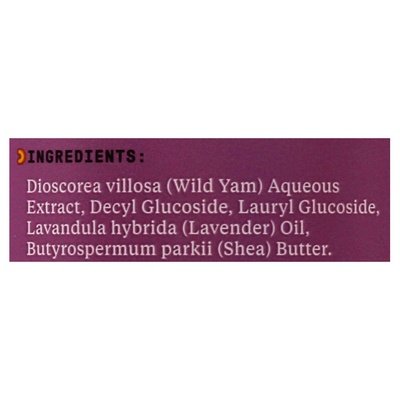 INGREDIENTS: Dioscorea Villosa (Wild Yam) Aqueous Extract, Decyl Glucoside, Lauryl Glucoside, Lavandula Hybrida (Lavender) Oil, Butyrospermum Parkii (Shea) Butter.