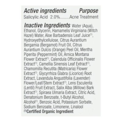 INGREDIENTS: Active Ingredients: Salicylic Acid (2.0 %), Acne treatment. Inactive Ingredients: Water (Aqua), Ethanol, Glycerin, Hamamelis Virginiana (Witch Hazel) Water, Aloe Barbadensis Leaf Juice (Certified Organic Ingredient), Hydroxyethylcellulose, Citrus Aurantium Bergamia (Bergamot) Fruit Oil, Citrus Aurantium Dulcis (Orange) Peel Oil, Mentha Piperita (Peppermint) Oil, Arnica Montana Flower Extract (Certified Organic Ingredient), Calendula Officinalis Flower Extract (Certified Organic Ingredient), Camellia Sinensis Leaf Extract (Certified Organic Ingredient), Chamomilla Recutita (Matricaria) Flower Extract (Certified Organic Ingredient), Glycyrrhiza Glabra (Licorice) Root Extract, Lavandula Angustifolia (Lavender) Flower/Leaf/Stem Extract (Certified Organic Ingredient), Lens Esculenta (Lentil) Fruit Extract, Salix Alba (Willow) Bark Extract (Certified Organic Ingredient), Spiraea Ulmaria Extract, Citric Acid, Denatonium Benzoate, T-Butyl Alcohol, Alcohol (Certified Organic Ingredient), Benzoic Acid, Potassium Sorbate, Sodium Benzoate, Limonene, Linalool.