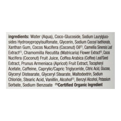 INGREDIENTS: Aqua (Water), Coco-Glucoside, Sodium Laurylglucosides Hydroxypropylisulfonate, Glycerin, Xanthan Gum, Cocos Nucifera (Coconut) Oil (Certified Organic Ingredient) or, Camellia Sinensis Leaf Extract (Certified Organic Ingredient), Chamomile Recutita (Matricaria) Flower Extract (Certified Organic Ingredient), Cocos Nucifera (Coconut) Fruit Juice, Coffee Arabica (Coffee) Leaf/Seed Extract, Prunus Armeniaca (Apricot) Fruit Extract, Alcohol (Certified Organic Ingredient), Anise Alcohol, Caffeine, Caprylic/Capric Triglyceride, Citric Acid, Dextrose, Lauryl Glucoside, Maltodextrin, Sodium Chloride, Stearyl Citrate, Tocopheryl Acetate, Vanillin, Benzoic Acid, Benzyl Alcohol, Potassium Sorbate, Sodium Benzoate.