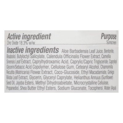 INGREDIENTS: Active Ingredients: Zinc Oxide (18.3 %), Sunscreen. Inactive Ingredients: Aloe Barbadensis Leaf Juice, Bentonite, Bisabolol, Butyloctyl Salicylate, Calendula Officinalis Flower Extract, Camellia Sinensis Leaf Extract, Caprylhydroxamic Acid, Caprylic/Capric Triglyceride, Capryloyl Glycerin/Sebacic Acid Copolymer, Cellulose Gum, Cetearyl Alcohol, Chamomilla Recutita (Matricaria) Flower Extract, Coco-Glucoside, Ethyl Macadamiate, Ginkgo Biloba Leaf Extract, Glycerin, Glyceryl Caprylate, Helianthus Annuus (Sunflower) Seed Oil, Jojoba Esters, Methyl Dihydroabietate, Microcrystalline Cellulose, Propanediol, Shea Butter Ethyl Esters, Sodium Gluconate, Tocopherol, Water (Aqua).