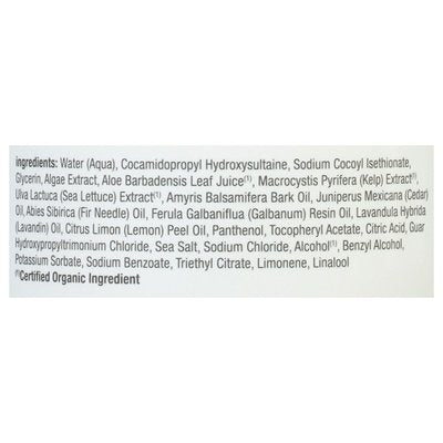 INGREDIENTS: Water (Aqua), Cocamidopropyl Hydroxysultaine, Sodium Cocoyl Isethionate, Glycerin, Algae Extract, Aloe Barbadensis Leaf Juice (Certified Organic Ingredient)), Macrocystis Pyrifera (Kelp) Extract (Certified Organic Ingredient), Ulva Lactuca (Sea Lettuce) Extract (Certified Organic Ingredient)), Amyris Balsamifera Bark Oil, Juniperus Mexicana (Cedar Oil, Abies Sibirica (Fir Needle) Oil, Ferula Galbaniflua (Galbanum) Resin Oil, Lavandula Hybrida (Lavandin) Oil, Citrus Limon (Lemon) Peel Oil, Panthenol, Tocopheryl Acetate, Citric Acid, Guar Hydroxypropyltrimonium Chloride, Sea Salt, Sodium Chloride, Alcohol (Certified Organic Ingredient), Benzyl Alcohol, Potassium Sorbate, Sodium Benzoate, Triethyl Citrate, Limonene, Linalool.