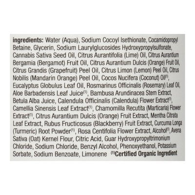 INGREDIENTS: Aqua (Water), Sodium Cocoyl Isethionate, Cocamidopropyl Betaine, Glycerin, Sodium Laurylglucosides Hydroxypropylsulfonate, Cannabis Sativa Seed Oil, Citrus Aurantifolia (Lime) Oil, Citrus Aurantium Bergamia (Bergamot) Fruit Oil, Citrus Aurantium Dulcis (Orange) Fruit Oil, Citrus Grandis (Grapefruit) Peel Oil, Citrus Limon (Lemon) Peel Oil, Citrus Nobilis (Mandarin Orange) Peel Oil, Cocos Nucifera (Coconut) Oil (Certified Organic Ingredient), Eucalyptus Globulus Leaf Oil, Rosmarinus Officinalis (Rosemary) Leaf Oil, Aloe Barbadensis Leaf Juice (Certified Organic Ingredient), Bambusa Arundinacea Stem Extract, Betula Alba Juice, Calendula Officinalis (Calendula) Flower Extract (Certified Organic Ingredient), Camellia Sinensis Leaf Extract (Certified Organic Ingredient), Chamomilla Recutita (Marticaria) Flower Extract (Certified Organic Ingredient), Citrus Aurantium Dulcis (Orange) Fruit Extract, Mentha Citrate Leaf Extract, Rubus Fructicosus (Blackberry) Fruit Extract, Curcuma Longa (Turmeric) Root Powder (Certified Organic Ingredient), Rosa Centifolia Flower Extract, Alcohol (Certified Organic Ingredient), Avena Sativa (Oat) Kernel Flour, Citric Acid, Guar Hydroxypropyltrimonium Chloride, Sodium Chloride, Benzyl Alcohol, Phenoxyethanol, Potassium Sorbate, Sodium Benzoate, Limonene.
