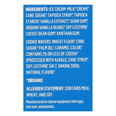 INGREDIENTS: Ice Cream: Milk (Organic), Cream (Organic), Cane Sugar (Organic), Tapioca Syrup (Organic), Tapioca Starch (Organic), Vanilla Extract (Organic) Guar Gum (Organic), Ground Vanilla Beans (Organic), Soy Lecithin (Organic), Locust Bean Gum (Organic), Xanthan Gum. Cookie Wafers: Wheat Flour (Organic), Cane Sugar (Organic), Palm Oil (Organic), Caramel Color (Organic), Contains 2% or Less of: Cocoa (Organic) (Processed with Alkali), Cane Syrup (Organic), Soy Lecithin (Organic), Salt, Baking Soda, Natural Flavor (Organic).