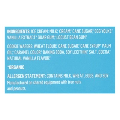 INGREDIENTS: Ice Cream: Fresh Organic Cream, Organic Dehydrated Cane Juice, Organic Skim Milk, Organic Egg Yolks, Organic Vanilla, Carob Bean Gum, Guar Gum. Chocolate Wafer: Organic Wheat Flour, Organic Sugar, Organic Cane Syrup, Organic Palm Oil, Organic Caramel Color, Baking Soda, Soy Lecithin (Non GMO), Natural Vanilla Flavor, Salt, Organic Cocoa.