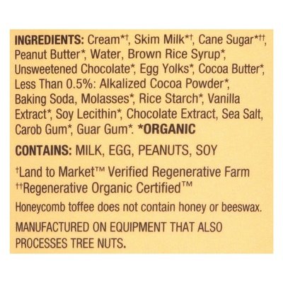 INGREDIENTS: Cream (Organic) (Land to Market Verified Regenerative Farm), Skim Milk(Organic) (Land to Market Verified Regenerative Farm), Cane Sugar(Organic) (Regenerative Organic Certified), Peanut Butter (Organic), Water, Brown Rice Syrup (Organic), Unsweetened Chocolate (Organic), Egg Yolks (Organic), Cocoa Butter (Organic), Less than 0.5%: Alkalized Cocoa Powder (Organic), Baking Soda, Molasses (Organic), Rice Starch (Organic), Vanilla Extract (Organic), Soy Lecithin (Organic), Chocolate Extract, Sea Salt, Carob Gum (Organic), Guar Gum (Organic).