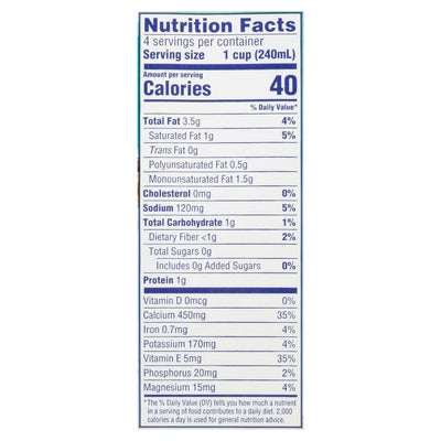 PRODUCT DETAILS: Almondmilk coconutmilk blend. No artificial flavors or colors. 40 calories per serving. Dairy free. Gluten free. Dairy & lactose-free. Soy-free. Egg-free. 50% more calcium than dairy milk (1 cup of regular dairy milk contains 300mg calcium vs 1 cup of almond breeze contains 450mg calcium). No added sugar. Almond Breeze: 35% DV (450mg); Dairy Milk: 25% DV (300mg) (1 cup of regular dairy milk contains 300mg calcium vs 1 cup of Almond Breeze contains 450mg calcium). Excellent source of vitamin E. Cholesterol free (almond milk, a cholesterol-free food). Non GMO Project verified. nongmoproject.org. Almonds. The best almonds make the best almondmilk. Every cup of Almond Breeze is carefully crafted with the best almonds. For over 100 years, our co-op of California family owned orchards has been dedicated to growing the Blue Diamond almonds that give Almond Breeze the delicious, creamy taste you'll love. - Ken and Jason Chandler. Growers for 3 generations. Casein free. Carrageenan-free. Taste Guarantee: If you are not satisfied with the taste, we guarantee your money back. For specific details, visit almondbreeze.com. almondbreeze.com. how2recycle.info. Scan me for an exciting experience! Facebook: Find us on Facebook. SmartLabel: Scan barcode with SmartLabel app for more information. To learn more, please visit us at www.bluediamond.com/faqs or scan product UPC code for SmartLabel page. Questions or comments? Contact Blue Diamond customer support at 1 (800) 987-2329 or support(at)bdgrowers.com. Please include code number found on pack with all inquiries. almondbreeze.com. Tetra Pak: Protect what's good. Tetra Pak Tatra Brik Aseptic. How we make a difference: California almond growers have reduced their water usage by 33% for every 1 lb of almonds grown. Almondmilk produces 78% less carbon emissions than dairy milk. We partner with Project Apis m. to help honeybees thrive before, during and after the almond bloom. For more information, please visit us at www.bluediamond.com/sustainability. Rainforest Alliance Certified. FSC: Mix board from responsible sources. www.fsc.org.
