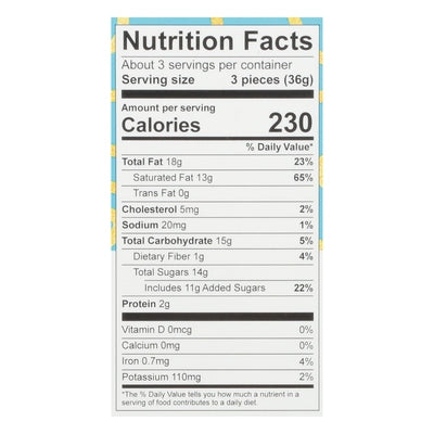 INGREDIENTS: (Fair Trade Certified by Fair Trade USA, Total 81% Fair Trade Ingredients) Organic Raw Cane Sugar, (Fair Trade Certified by Fair Trade USA, Total 81% Fair Trade Ingredients) Organic Cocoa Butter, Organic Whole Milk, (Fair Trade Certified by Fair Trade USA, Total 81% Fair Trade Ingredients) Organic Coconut Oil, (Fair Trade Certified by Fair Trade USA, Total 81% Fair Trade Ingredients) Organic Cacao Beans, Natural Flavors, (Fair Trade Certified by Fair Trade USA, Total 81% Fair Trade Ingredients) Organic Vanilla Beans.
