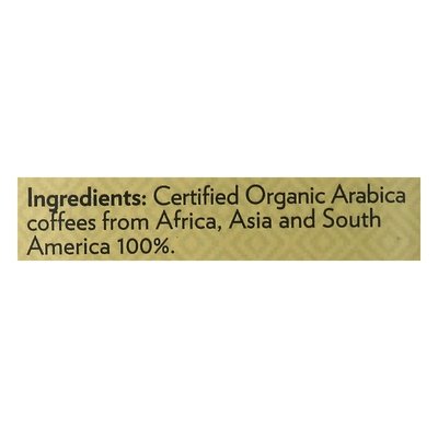 INGREDIENTS: Certified Organic Arabica Coffees from Africa, Asia and South America 100%.