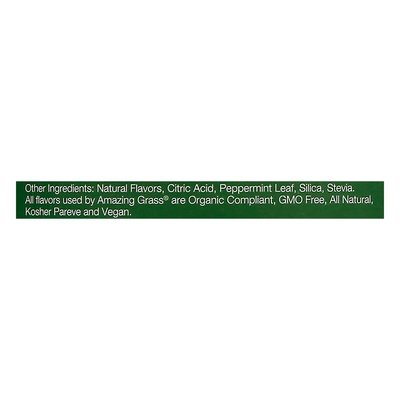 INGREDIENTS: Amazing Grass Green Food Blend: Organic Wheat Grass, Organic Barley Grass, Organic Alfalfa Grass, Organic Spinach, Organic Spirulina, Organic Chlorella (Cracked Cell-Wall), Organic Broccoli. Energy Blend: Organic Yerba Mate Leaf Extract, Matcha Green Tea Leaf. Amazing Grass Antioxidant Blend: Organic Rose Hips, Organic Pineapple, Organic Carrot, Acerola Cherry Extract, Organic Maca Root, Organic Acai Berry, Organic Beet Root, Raspberry. EFA Fiber Blend: Organic Flax Seed, Apple Pectin. Digestive Enzyme & Active Culture Pre/Probiotic Blend: F.O.C (Fructooligosaccharide), Amylase (Aspergillus Oryzae), Protease (Aspergillus Oryzae), Lipase (Aspergillus Niger), Lactase (Aspergillus Oryzae), Cellulase (Trichoderma Reesei), Lactobacillus Acidophilus. Other Ingredients: Natural Flavor, Citric Acid, Peppermint Leaf, Silica, Stevia Leaf Extract (Reb A).