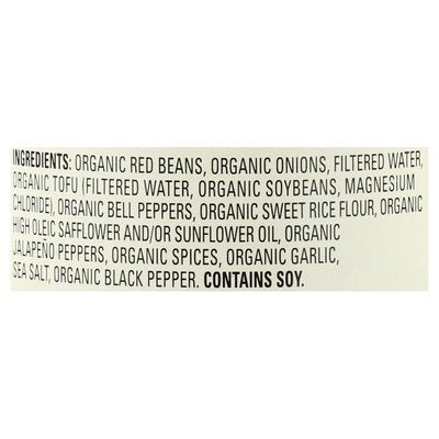 INGREDIENTS: Organic Red Beans, Organic Onions, Filtered Water, Organic Tofu (Filtered Water, Organic Soybeans, Magnesium Chloride), Organic Bell Peppers, Organic Sweet Rice Flour, Organic High Oleic Safflower and/or Sunflower Oil, Organic Jalapeno Peppers, Organic Spices, Organic Garlic, Sea Salt, Organic Black Pepper.