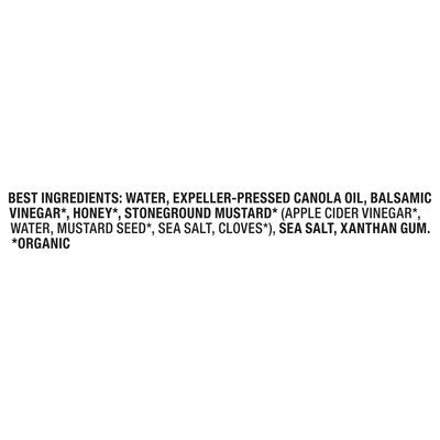 INGREDIENTS: Best Ingredients: Water, Expeller-Pressed Canola Oil, Balsamic Vinegar (Organic), Honey (Organic), Stoneground Mustard (Organic) (Apple Cider Vinegar (Organic), Water, Mustard Seed (Organic), Sea Salt, Cloves (Organic)), Sea Salt, Xanthan Gum.