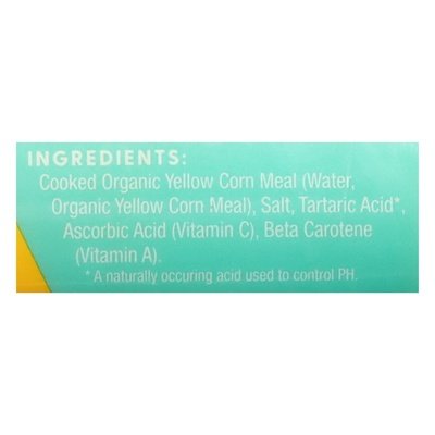 INGREDIENTS: Cooked Organic Yellow Corn Meal (Water, Organic Yellow Corn Meal), Salt, Tartaric Acid (a Naturally Occurring Acid Used to Control pH), Ascorbic Acid (Vitamin C), Beta Carotene (Vitamin A).